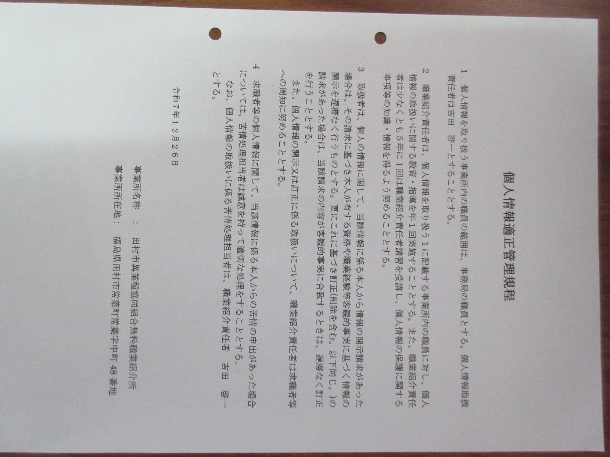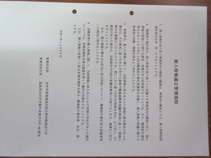 無料職業紹介事業届出に際して、個人情報適正管理規程を改定した。